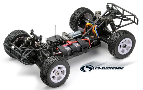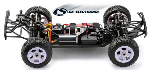 Vielmehr war auch hier das Ziel, einen leichten, robusten und extrem schnellen 1/8 4WD Shourt Course zu konstruieren. Zudem besticht das Chassis durch eine perfekte links/rechts Gewichtsbalance und einer optimalen Gewichtsverteilung von Vorne und Hinten. In der Luft beim Springen kann das Modell durch Gasgeben oder Bremsen die Fluglage korrigieren, exakt wie bei den Nitro-Modellen.