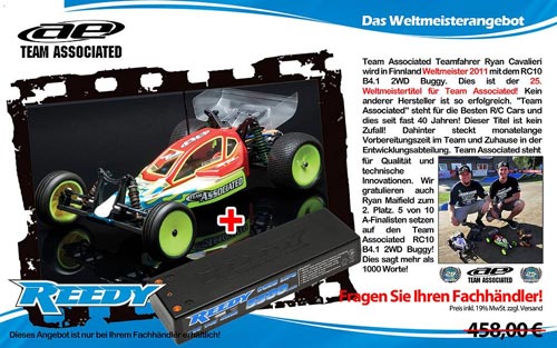 | | Zum Gewinn des 26. Weltmeistertitels für TEAM ASSOCIATED gibt es beide Siegerfahrzeuge der WM in Finnland zum Vorteilspreis. Beide Fahrzeuge sind im Set mit einem Reedy Lipo 7.4V 60C High-Performance Akku erhältlich. Seit über 40 Jahren ist Team Associated der führende R/C Car Hersteller weltweit! Kein anderer Hersteller kann so viele WM Titel vorweisen!