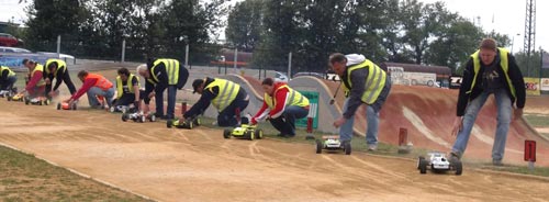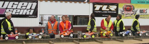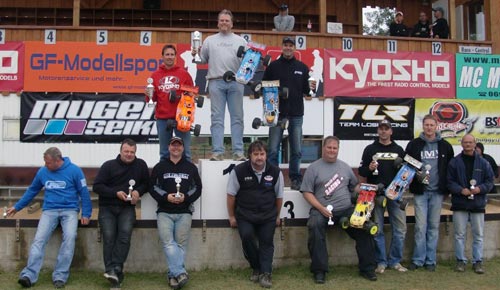 Nach einer kurzen Lade-, Reparaturpause ging es dann um den letzten Lauf des Wochenendes, dass Finale. Daniel Reckward war mit seinem RB befeuertem Mugen das ganze Wochenende bereits am schnellsten gewesen, so dass er auch im Finale von Startposition 1 los fahren konnte. Auf Platz zwei startete der Lokalmatador Maximilian Cordts, der ebenfalls eine beachtliche Performance das ganze Wochenende zeigte. Carsten Keller, der Gewinner aus Welden, konnte sich nicht so recht auf die Strecke in Bischofsheim einstellen, so dass Ihm immer einige Zehntel und Sekunden zur Spitze fehlten. Er musste sich bei der Startaufstellung mit Platz 4 begnügen. Kaum war das Finale gestartet, sahen die Zuschauer ein Start/Ziel Sieg von Daniel Reckward. Runde um Runde hat er sein Programm abgespult, ohne nennenswerte Fehler. Den Speed konnte lediglich der Maximilian Cordts mitgehen. Leider hatte er Funkstörungen und musste 15 min vor Schluss eine Zwangspause einlegen. Es ging um Platz 2, wer sollte den Podiumsplatz gewinnen? Nach einigen durchwachsenen Runden vom Carsten Keller gab er eins ums andere mal Gas und fuhr so auf Platz 2, gefolgt von Tim Bremicker mit Platz 3.