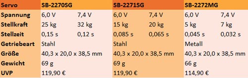 So können nun zwei Servos mit Stahl- und ein Servo mit Metallgetriebe präsentiert werden, deren Stellzeiten bei 7,4 V je nach Typ bereits bei unglaublichen 0,032 s für 60° beginnen und bis zu 32 kg Stellkraft reichen. Die Einsatzbereiche erstrecken sich von RC-Cars im harten Offroad-Einsatz bis hin zu Helikoptern mit flybarless Systemen. Die genauen Daten können der folgenden Tabelle entnommen werden. Die Servos sind ab sofort über den Fachhandel zu beziehen.
