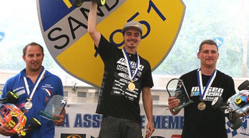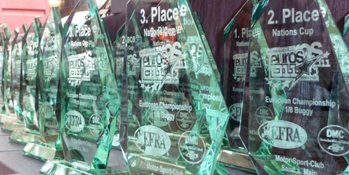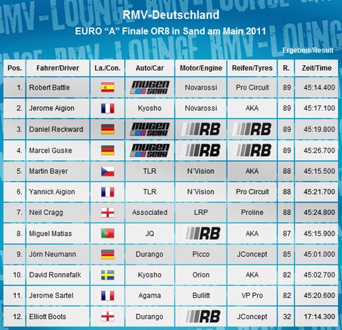 Dies sollte auch der Schlüssel zum Erfolg werden. Jerome machte kurz vor seinem letzten Tankstopp noch einen Fehler, den Daniel ausnutzte, um erneut in Führung zu gehen. Dann folgte Daniels Tankstopp und Robert sowie Jerome konnten sich beide vor ihn in Position fahren. Leider driftete dann auch noch David Ronnefalk in der letzten Runde auf die falsche Fahrbahnseite ab und drehte Daniels Mugen Seiki MBX-6 einmal um 180 Grad! Somit war ein Angriff auf den zweiten Platz leider für Daniel Reckward nicht mehr möglich. Robert Battle gewinnt diese Europameisterschaft 2011, vor Jermoe Aigoin und Daniel Reckward. Auch Marcel Guske fuhr einen schnellen Finallauf und kam am Ende sogar noch auf einen verdienten vierten Platz. Mit ein bisschen mehr Glück im Halbfinale, wäre Marcel Guske sicherlich auch vorne mitgefahren. Somit ist Mugen Seiki zum vierten Mal hintereinander Europameister dieser Klasse OR8! Herzlichen Glückwunsch!