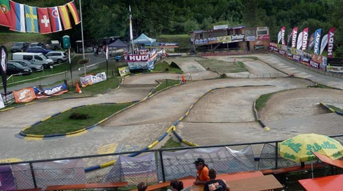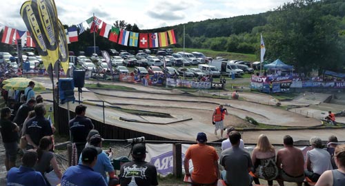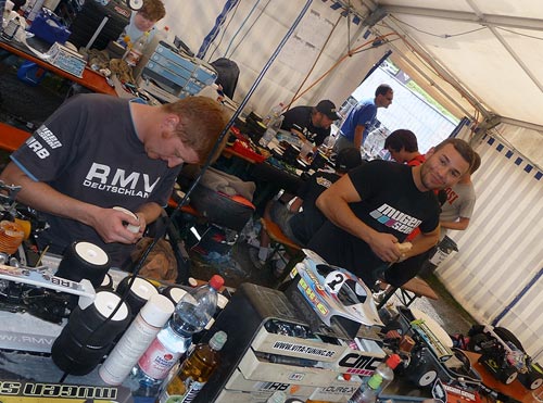 Neugierig nahmen die ersten Teilnehmer bereits am Montag die Strecke unter die Lupe und versorgten sich daraufhin in den jeweiligen Containern der Firmen, die entsprechenden Ersatzteile – immer in der Hoffnung die richtige Einschätzung zur Rennstrecke getroffen zu haben! Auch RMV Deutschland war mit einem Container vertreten, um ihren Fahrern den Support zu gewährleisten. Um die Bahn vor Regen zu schützen, wurde diese schon Wochen vorher von den Mitgliedern des MSC Sand e.V. mit Folie abgedeckt. Somit entstanden keine Wasserrinnen und zum ersten Tag der „Euro“, dem Dienstag, war die Bahn in einem optimalen Zustand. Hierdurch konnten die Teilnehmer ihre Fahrzeuge in jeweils zwei Trainingsläufen auf die Strecke abstimmen und am Setup feilen. Am besten gelang dieses Daniel Reckward, der um 0,2 Sekunden schneller war als Yannick Aigon und Robert Battle. Aber auch das „Verfolgerfeld“ war mit den Rennzeiten dicht beisammen. Der Mittwoch verlief, wie der Dienstag, mit dem Absolvieren der jeweiligen Trainingsläufe. Mit je zwei Trainingsläufen bestand für jeden Fahrer die Chance, das Setup des Vortages noch einmal zu verbessern. Auch die Entscheidung für den richtigen Reifen war jetzt schon von besonderer Bedeutung für die anstehenden Vorläufe des nächsten Renntages – auch immer im Hinblick auf das dauerhaft wechselnde Wetter, das bei den Rennen auch eine tragende Rolle spielt. Die schnellste Trainingszeit wurde dieses Mal von Martin Bayer gefahren. Dahinter reihten sich Renaud Savoya und Jerome Aigoin ein. Nach dieser Rangliste wurden für die Vorläufe, die in 10er Gruppen gefahren wurden, nun eine neue Gruppeneinteilung für den nächsten Tag erstellt.