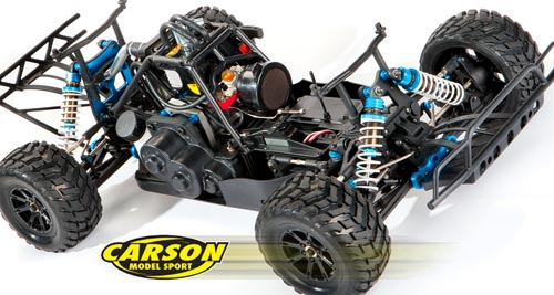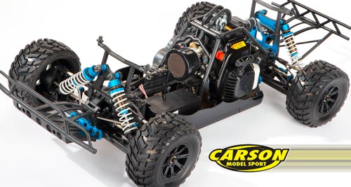 | | Der Desert Attack G5 RTR im Maßstab 1:5 von Carson-Model Sport sorgt mit seinem bärenstarken 27 ccm Benzinmotor für heiße Off Road Action. Allradantrieb und der coole Sound des 2-Taktmotors zeichnen den Desert Attack aus. Unkomplizierte Technik und das benötigte, handelsübliche 2-Takt-Benzingemisch erleichtern das Handling. Stabile Aluteile, wie die 4 mm Chassisplatte oder die Alu-Dämpferbrücke, sorgen für die nötige Stabilität. Die Fahrwerksabstimmung ist dank zahlreicher Set-Up-Optionen an jedes Gelände und jeden Fahrer möglich. Der Desert Attack ist fahrfertig aufgebaut und mit der Reflex Wheel Pro LCD R/C Anlage ausgestattet. Sicherheitsfeatures wie z.B. ABS-, Dual Rate- und Fail Safe-Funktion sorgen für sichere Action mit dem Desert Attack G5 RTR.