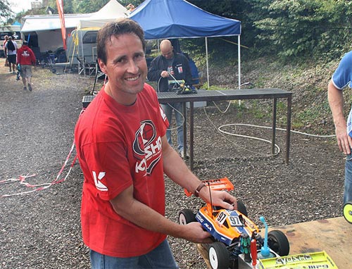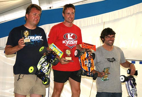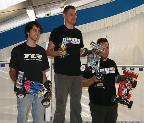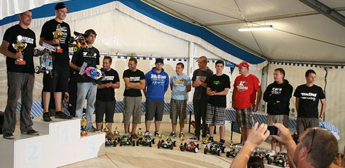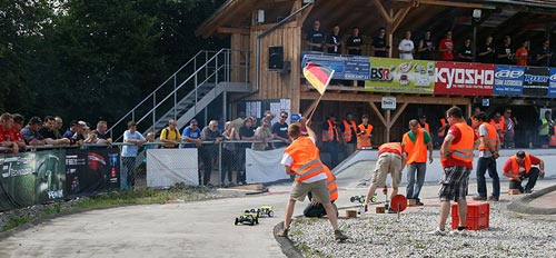Für das Team KYOSHO konnte sich Thomas Paßmann für das Finale qualifizieren, dach dem Tim Bremicker und Gerhard Frank leider beide in ihrem Halbfinale hängen geblieben sind. Nach einer 40 Minuten dauernden Hitzeschlacht mit einzelnen Regentropfen in den letzten Minuten sicherte sich Thomas den 10. Platz im Finale. Der Sieg ging verdient an Jörn Neumann, der mit einer fast fehlerfreien Vorstellung souverän den Laufsieg einfuhr. Dennoch reichte Daniel Reckward ein 2. Platz um sich in Verbindung mit seinem Sieg in Schwedt erneut die Deutsche Meisterschaft zu sichern und holte den Titel vor Hannes Käufler und Stefan Byesse.
