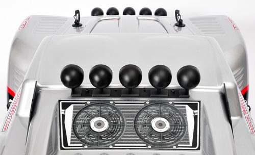 Das aggressive Styling der Karosserie wird durch die riesigen 190mm großen Xross-MAX Reifen noch unterstrichen. Die 7-Speichen Beadlock Felgen sehen zum einen echt cool aus, schonen aber auch den Geldbeutel und die Nerven da der Reifen nicht verklebt werden muss. Die Scheinwerfer lassen ein nachträgliches Ausrüsten mit Licht zu um noch mehr Scale Charakter zu erhalten. Der Heckspoiler aus Plastik ist nicht nur Zierde sondern erzeugt ein deutlich stabileres Heck.