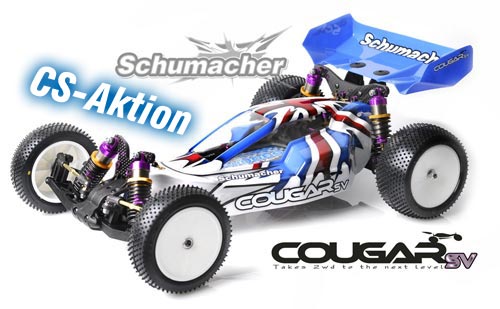 | | CS-Electronic liefert Ihnen im Zuge seiner „CS-Schumacher 2WD 1/10 Offroad Buggy Cougar SV RACE S1 Aktion“ dieses Modell mit einem Sonderrabatt von 44% zum absoluten Sonderpreis von 149,90€.