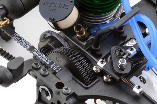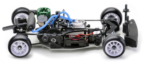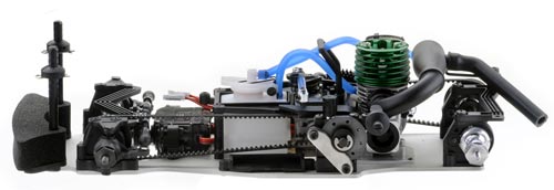 Der Spada 09L ist auf einem sehr leichten Chassis aus 17S Duraluminium aufgebaut, das die solide Basis für den Boliden darstellt. Die L-Version ist besitzt einen 24 mm längeren Radstand und die Materialstärke des Chassis ist auf 3 mm angewachsen. Und auch die Bodenfreiheit wurde beim 09L auf 8mm angehoben, um den Einsatzbereich zu erweitern. Die Kraftverteilung erfolgt auf alle vier Räder über ein sehr leichtgängiges Zahnriemensystem. Die Vorderachse ist als Starrachse ausgelegt. Die Hinterachse ist mit einem hochwertigen Kugeldiff ausgestattet, das sich stufenlos sperren lässt. Der gesamte Antriebsstrang ist mit 14 Kugellagern komplett gelagert.
