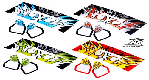 | | Ansmann Racing liefert passend zu seinen Downforce2 Heck- Spoilern farbig abgestimmte Decor Sets. Gestalten Sie ihren Heckspoiler selbst. 4 farblich verschiedene Designs stehen zur Auswahl. Die Aufkleber sind aus einer stabilen hochwertigen Folie gearbeitet, sie sind vorgestanzt und leicht zu montieren.