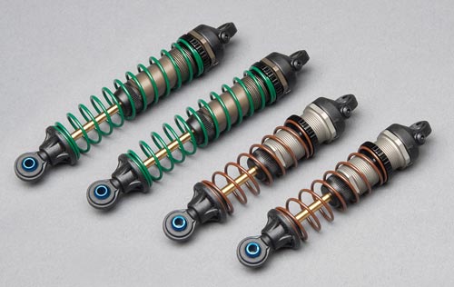 • „Factory Team“, hart eloxierte Gewinde-Dämpfer in „V2“ Version mit Kappen samt Entlüftungs-Schrauben.