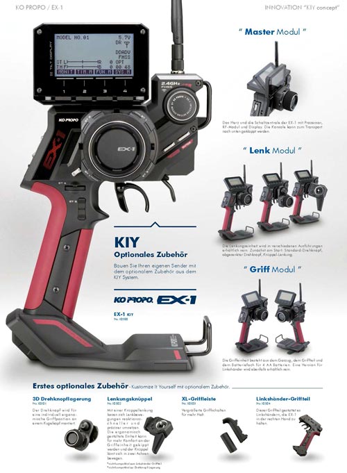 | | Die Innovation des Jahres! KO Propo, der führende Hersteller für Fernsteuerungs- Systeme, veröffentlicht erste Informationen zum neuen Flaggschiff des EX - Serie. Die EX-1 eröffnet vollkommen neue Möglichkeiten und setzte neue Maßstäbe was Individualität und Performance anbelangt.