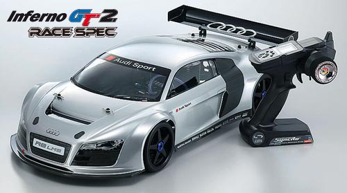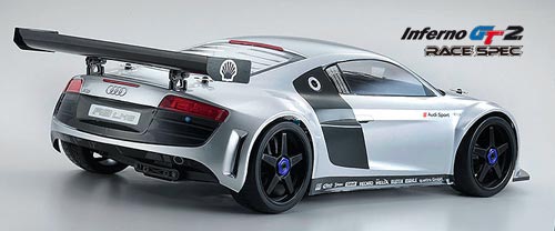 | | Mit dem Inferno GT2 Race Spec Audi R8 im Maßstab 1:8 führt Kyosho ein neues Qualitätsniveau in der Klasse der Ready Sets ein. Neben einem zeitgemäßen 2.4GHz-Fernsteuersystem, verfügt der Race Spec über einen hochwertigen Rennmotor und weitere Features, die sonst nur bei hochpreisigen Wettbewerbsmodellen zu finden sind. Unter der edlen Karosserie verbirgt sich die hochkarätige Technik aus Kyosho's Weltmeister-Fahrzeug Inferno. Der KE-25 Xtreme Power Motor besitzt eine SG-Kurbelwelle und verleiht dem GT2 ein atemberaubendes Leistungspotential. Die Schwungscheibe wurde gegenüber dem Vorgänger um 10 mm auf 34 mm Durchmesser reduziert, um die bewegte Masse zu reduzieren. Dadurch wird das Ansprechverhalten des Triebwerks spürbar agiler. Zudem verfügt der KE-25 über einen neuen, ergonomisch geformten Seilzugstartergriff, um einen sicheren Halt in der Hand zu gewährleisten. Wilde Drifts, extreme Beschleunigung und hoher Top-Speed garantieren atemberaubende Fahrerlebnisse auf jeder Strecke!