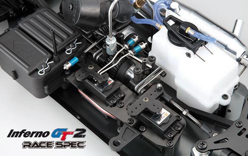 Das GT2-Chassis verfügt über eine hochbelastbare Doppelscheibenbremse und ist auf den typischen Glattbahneinsatz abgestimmt. Der permanente Allradantrieb garantiert die effiziente Umsetzung der Motorleistung in Vortrieb. Der Tank hat ein Fassungsvermögen von 150 ml und ermöglicht dadurch Fahrzeiten von ca. 11 Minuten. Die Spurstangen verfügen über R/L-Gewinde und stammen aus dem bewährten Inferno US Sports.