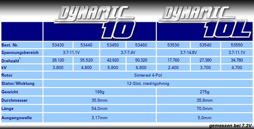 | | Die LRP Dynamic 10 Brushless Motoren Linie bietet High- End Motoren in 540 und 550er Baugröße für den universellen Einsatz in R/C Cars im Maßstab 1/10. Die Besonderheit der Dynamic 10 Motoren - sie sind sowohl für den Betrieb mit als auch ohne Sensorsteuerung ausgelegt und können somit mit nahezu jedem Brushlessregler betrieben werden.