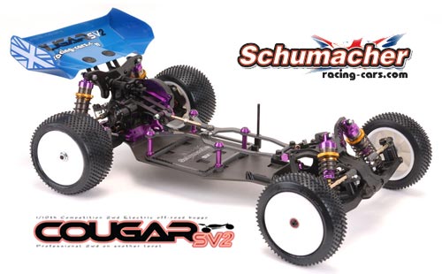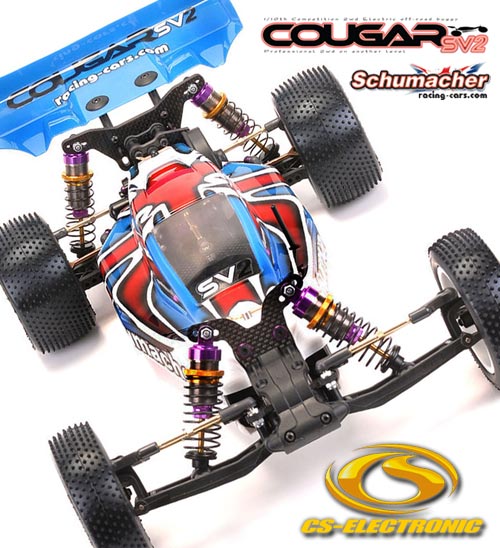 | | Der neue Schumacher Cougar SV2 2WD Wettbewerbs Buggy für die Klasse 1/10 Offroad wurde basierend auf dem erfolgreichen Cougar SV weiterentwickelt. Der neue SV2 ist niedriger, schlanker und vor allem schneller! Er hat nun ein gehärtetes Alu-Chassis, eine neues Heavy-Duty Differential und Getriebe. Zusätzlich wurden die Antriebswellen weiter verbessert. Mit dem Mittel-Motor Konzept, ultrakompakten Design und der revolutionären Lenkungsgeometrie die einen konstanten Lenkungswinkel über den gesamten Lenkbereich ermöglicht ist der Cougar SV2 ein Siegeskandidat auf jeder Rennstrecke.