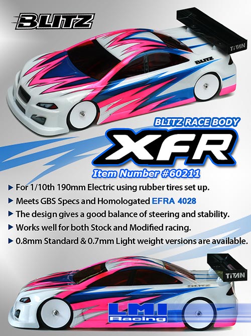 Mit der BLITZ XFR liefert LMI Racing eine weitere Wettbewerbs- Karosserie für 190mm Tourenwagen Chassis. Diese ist ebenfalls EFRA (4028) Legal und in zwei Versionen (0,7mm und 0,8mm) lieferbar.
