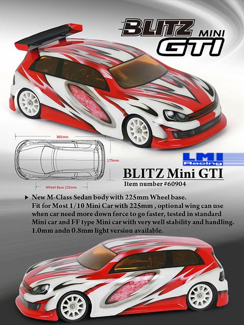 Mit der neuen BLITZ Mini GTI-Karosserie liefert LMI Racing eine weitere Karosserie für das M-Chassis. Diese kann auf Chassis mit einem Radstand von 225mm verwendet werden und ist in 0,8 und 1mm starkem Polycarbonat lieferbar.
