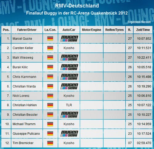 Das Finale wurde von RMV/Mugen Pilot Marcel Guske mit seinem MBX-6 ECO dominiert, der den stark fahrenden Carsten Keller (Kyosho) auf die zweite Position verweisen konnte. Auf den weiteren Plätzen folgte mit Wiesweg, Kilic, Kamann und Warda ein Teil der Mugen-Armada, die damit erneut eindrucksvoll unter Beweis stellten, dass der MBX-6 ECO momentan in der Brushless-Klasse das Mass der Dinge ist. Die Tatsache, dass 7 der 12 Fahrzeuge im Finale ein Mugen MBX-6 ECO waren, ist ein weiteres klares Indiz für die Dominanz dieses Fahrzeugs und die hervorragende Arbeit die RMV Deutschland auf der Vertriebsseite hier leistet.