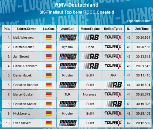 Im Finale des SK-Laufs konnte Maik Wiesweg vom Start weg die Führung übernehmen. Seine Freude darüber währte jedoch nicht lange, als er sich nach 3 Runden an einer ungünstigen Stelle überschlug und das gesamte Feld vorbeiziehen lassen musste. Auch in der darauffolgenden Runde unterlief ihm ein kleiner Fehler, als sein Fahrzeug hängen blieb, womit sich sein Rückstand auf die Spitze auf 20 Sekunden addierte. Daniel Reckward hatte nun die Spitze übernommen, während in der 11. und 12. Runde mit Johannes Marx und Lukas Strohtmann zwei Fahrer des RCCC-Coesfeld das Rennen frühzeitig beenden mussten. Ab dem zweiten Tankstopp konnte dann Jan Sievert die Führung erobern, die er vor Daniel Reckward und Carsten Keller bis zur 22. Minute behauptete, diese dann aber an Carsten Keller abgeben musste. Es zeigte sich deutlich, dass es schwer werden würde für Carsten Keller die Spitze zu behaupten, denn nach seinen anfänglichen Missgeschicken stürmte Maik Wiesweg nun unaufhaltsam durchs Feld und konnte sich nach 24 Minuten bereits wieder bis auf Platz 2 hinter dem Führenden vorarbeiten. Der Abstand zu Carsten Keller verringerte sich zusehends und nach 26 Runden betrug der Abstand lediglich noch 2 Sekunden. Die eine oder andere Überrundung ließ den Abstand zeitweise etwas anwachsen, in der vorletzten Runde jedoch konnte Maik Wiesweg dann aber an Carsten Keller vorbeiziehen und die Führung übernehmen, die er bis ins Ziel nicht mehr abgab. Platz 2 ging an unseren Jugendlichern Jan Sievert, der damit den Deutschen Rekordmeister Daniel Reckward hinter sich ließ, der bei seiner Reifenwahl diesmal ganz offensichtlich keine glückliche Hand hatte. Im Gegensatz zu allen anderen Fahrern vertraute er anstatt auf die Soft-Mischung auf Medium-Reifen, was sich im Laufe des Rennens als nicht optimal herausstellte. Auf einem tollen 6. Platz konnte Christian Bessler das Ziel erreichen und rundete damit das positive Ergebnis der Coesfelder Fahrer bei diesem Rennen ab.