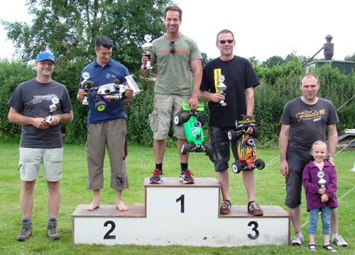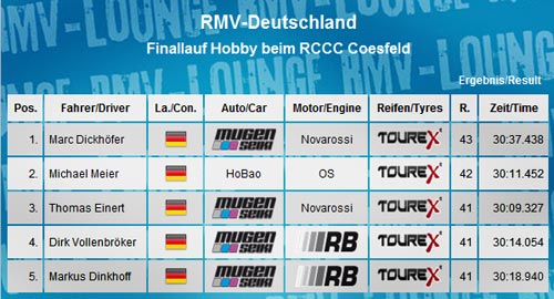 RMV Teamfahrer Maik Wiesweg setzte an diesem Wochenende zum ersten mal auf den neuen Mugen MBX-6 R EU, was sich als sehr positiv herausstellen sollte, denn schon nach dem ersten Vorlauf zeichnete sich deutlich ab, dass Mike an diesem Tag das Maß der Dinge sein sollte, denn er verpasste die neunte Runde nur denkbar knapp. Auch im zweiten Vorlaufdurchgang konnte er die gute Leistung auf ähnliche Art und Weise wiederholen und sich damit vorzeitig die TQ-Position sichern. Im dritten und letzten Vorlauf konnte er es daher locker angehen und diesen Lauf dazu nutzen um Reifen für die Finale zu testen, wobei sich hierbei die Tourex X300 in der Soft-Mischung als perfekte Wahl herausstellten. Pünktlich um 12:00 Uhr konnten die Vorläufe beendet werden, so dass nach der Mittagspause ab 13:00 Uhr das Rennen mit dem ersten Finallauf fortgesetzt wurde.