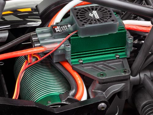 Um die Geschwindigkeiten des Castle Creations 2028-780kV Motors und die Größe, sowie das Gewicht des Baja 5B Flux handhaben zu können, hat Castle den Mamba XL2 Fahrtenregler entwickelt, der bis zu 8S LiPos (das sind 29,6Volt!) kontrollieren kann. Ein großer Lüfter sorgt bei dieser immensen Power für die notwendige Kühlung.