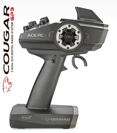 | | Die neue Thunder Tiger ACE RC COUGAR GP3 Pistolen-Fernsteuerungs-System für R/C-Cars wurde speziell für Fahrer entwickelt, die bei der Ausübung ihres Hobbys besonderen Wert auf höchste Präzision, bewährte Zuverlässigkeit und Bedienerfreundlichkeit legen. Eine ungemein gute Gewichts-Balance für ermüdungsfreies Bedienen und eine clever integrierte, nicht mehr störende Sender-Antenne sind die herausragenden Merkmale der handlichen Pistolen-Anlagen. Das neue IFHss+ 2,4GHz System in optimierter PLUS Version sorgt für einen absolut störungsfreien Betrieb ohne Frequenzprobleme. Der dritte Schalt-Kanal der GP3 Anlage ist ideal zur Nutzung von Sonder- Funktionen wie Gang-Schaltung oder Scheinwerfer- Ein/Aus.