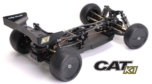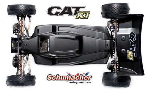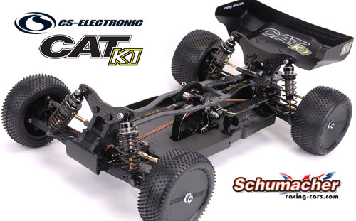 | | CS Electronic präsentiert mit dem CAT K1 von Schumacher Racing einen brandneuen 4WD-Wettbewerbs Buggy mit Aluchassis im Maßstab 1:10 vor. Zum Vorgänger SX3 wurde der K1 im Vergleich an zahlreichen Stellen überarbeitet. Am auffälligsten ist zuerst der neue “Stealth-Look” des CAT K1, so sind die Alu-Teile in edlem grau oder schwarz eloxiert. Purplefarbige Tunigteile bleiben aber zusätzlich im Programm.