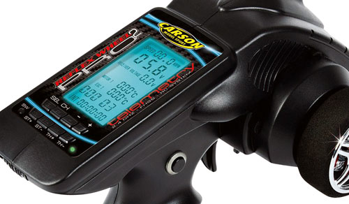 | | Das CARSON Reflex Wheel Pro II Telemetrie R/C-System ist die praktische Einsteigerversion der Reflex Wheel Telemetrie-Reihe und hat serienmäßig schon drei Sensoren im Lieferumfang. Die große und hell beleuchtete LCD-Anzeige zeigt dem Fahrer die aktuellen Werte von Drehzahl-, Empfängerakkuspannungs- und Temperatursensor für Motor und Regler an. Zusätzlich werden die Senderakkuspannung und eine Stoppuhr angezeigt. Diese wird „ganz nebenbei“ mit einem Zusatztaster am Sendergriff bedient. Für Sicherheit sorgen die FHSS-Übertragung sowie das programmierbare Failsafe mit Unterspannungsschutz. Das 3-Kanalsystem erlaubt die Steuerung einer Zusatzfunktion und verfügt über 15 Modellspeicher. Nützliche Funktionen wie ABS-Bremse, Dual Rate, Expontentialeinstellung, Servo Reverse und EPA sind sowieso vorhanden. So wird die CARSON Reflex Wheel Pro II Telemetrie zum Preisleistungssieger für ambitionierte R/C-Car-Piloten.