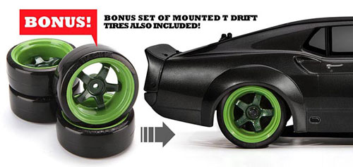 • 2 komplette Sets Custom Räder mit grünen Felgen. Ein Satz Driftreifen und ein Satz Reifen mit Griff