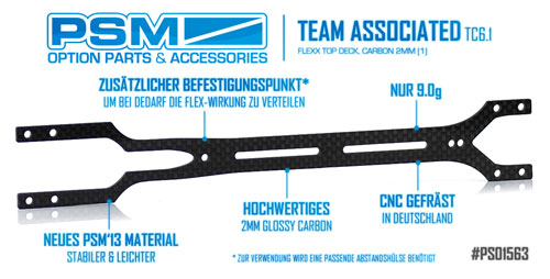 | | PSM Racing erweitert sein Programm mit einem neuen Carbon Tuningteil für den Associated TC6.1. Dieses Top-Deck besteht aus hochwertigem 2 mm Kohlefaser Material und gibt Ihren TC6.1 mehr Flex. Dank eines zusätzlichen Befestigungspunktes kann bei Bedarf die Flexwirkung verteilt werden.