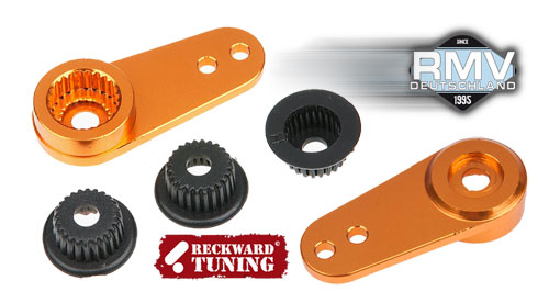 | | Alle beweglichen Teile im harten Renneinsatz unterliegen höchster Beanspruchung. Das gilt auch für Servohörner. RMV Deutschland liefert aus diesem Grund extrem stabile Aluminium- Servohörner. Neben der massiven Verarbeitung und Versteifung ergibt sich eine genauere Anlenkung, da keinerlei Flex mehr vorhanden ist.