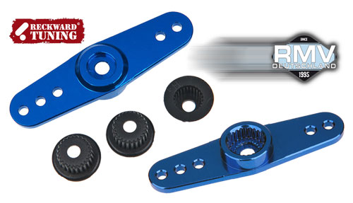Original Reckward-Tuning Aluminium Servo Arm in Blau für 23, 24 und 25T also gleich mit den passenden Kunststoffeinsätzen für PowerHD, Futaba, Hitec, JR, Ko Propo und Sanwa dabei.
