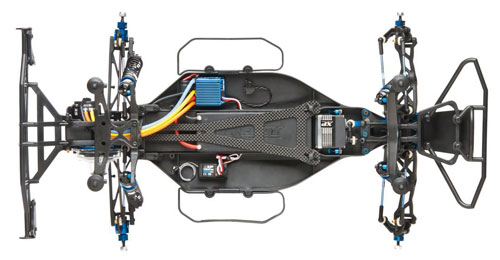 • Traditionelle 2WD-Heck-Motor-Konfiguration. Auch hierbei hat sich herausgestellt, dass ein solches Chassis-Layout immer noch die universell tauglichste Gewichts-Balance im RC-Car-2WD-Offroad-Racing darstellt. Dies gilt insbesondere im Short-Course-Truck, weil man dort Grund der Chassis-Länge extrem durch die Verschiebung der Akku-Position wirken kann, gerade wenn kurze „Shorty“ LiPos verwendet werden.
