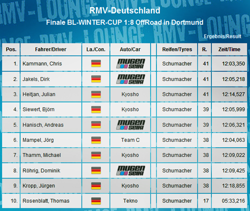 | | Am 10. April 2013 fand der 4. Lauf zum Brushless Winter-Cup auf der Intermodellbau Messe in Dortmund statt. Es gingen an diesem Mittwoch 30 Fahrer in der elektrisch angetriebenen Klasse 1:8 OffRoad an den Start. Die Strecke, mit einigen sehr schönen runden Sprüngen und 2 Überführungen, die der MC- Dortmund für das große EOS Rennen am darauf folgenden Wochenende aufgebaut hatte, sah super und sehr flüssig aus.