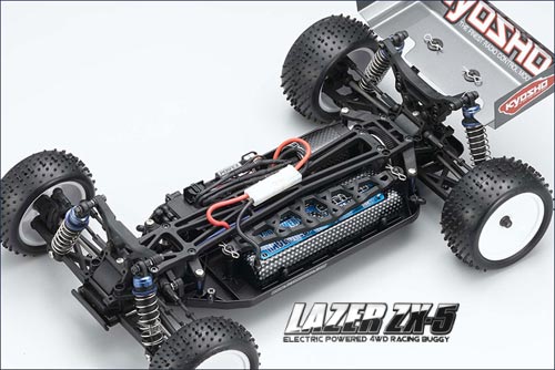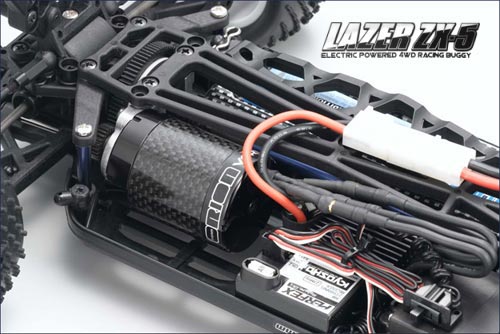 | | Kyosho präsentiert den LAZER ZX-5 Powered By Team Orion. In dieser Version kommt der Lazer mit einem bärenstarken Antriebspaket aus dem Hause Team Orion zur Auslieferung. Unter der Karosserie steckt der Vortex Experience Brushless Motor mit dem zugehörigen Vortex-Regler. Das System arbeitet sensorlos und ist wahlweise für NiMH- oder LiPo-Akkupacks ausgelegt. Der Regler verfügt über ein Auto-Setup, so dass keinerlei Programmierarbeiten erforderlich sind. Um den maximalen Fahrspaß mit dem ZX-5 RTR zu erzielen, empfiehlt Kyosho ausdrücklich den Einsatz der Team Orion LiPo Car Akkus.