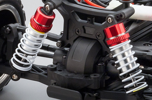 Der RAGE VE verfügt an Vorder- und Hinterachse über ein Differentialgetriebe und hochwertige BigBore Öldruckstoßdämpfer aus Aluminium mit justierbarer Federvorspannung. Die Dämpferbrücken sind aus 5 mm dickem Compound Kunststoff gefertigt, besitzen mehrere Befestigungspunkte für die Dämpfer und überstehen auch härtere Feindberührungen ohne Schaden. Die Einzelradaufhängungen verfügen über klassische Doppel-Querlenker mit einstellbaren Spuren, sowie einer speziell auf das Chassis angepasster Geometrie. Insgesamt verleiht das Fahrwerk dem RAGE VE eine perfekte Traktion für besonders hohe Kurvengeschwindigkeiten.