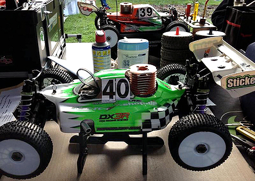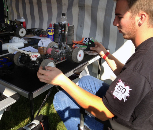 Finaltag: In der Nacht auf Sonntag hat es noch ausgiebig geregnet und die Strecke musste an einigen Stellen mit Sägemehl trockengelegt werden. Der Großteil war aber, dank einer gut funktionierenden Entwässerung, immer noch gut befahrbar. Das Wetter schien auch vorerst zu halten, es war trocken und größtenteils sonnig. Die ersten Finale, begonnen wurde mit 1/64 Finale, fuhren die Strecke weiter trocken, so dass die Bedingungen immer besser wurden. Kurz vor 11:00 Uhr war es dann soweit. Mein 1/8 Finale stand an. In der Vorbereitungszeit merkte ich, dass es sich als kleiner Nachteil erwies, gestern nicht auf feuchtem, bzw. nassem Untergrund gefahren zu sein. Der Grip auf der Strecke war merklich weiniger und dem sensiblen Gasfinger kam jetzt mehr Bedeutung zu. Aber das Fahrgefühl wurde von Runde zu Runde besser. Also voller Vorfreude auf die kommenden 20 Minuten rein in die Box und ab in die Startaufstellung. 10, 9, 8 …, die Flagge ging hoch und ich bin von Startplatz 4 aus gut weggekommen. Bis zur ersten Kurve. Hier gab es die üblichen Rempeleien und schon lag ich auf dem Dach. Als Einziger. Die erste Kurve habe ich dann als Letzter verlassen. Aber 20 Minuten sind lang, nur nicht aufgeben. Ich merkte dass die Fahrzeuge vor mir gar nicht so schnell unterwegs waren und ich zügig aufschließen und in der gleichen Runde schon wieder 2 Plätze gutmachen konnte. Geht doch dachte ich mir. Dann kam Runde drei. Ich befand mich im Platzkampf mit einem dänischen Kontrahenten und wir fuhren beide nebeneinander über das Waschbrett und anschließend durch die Kurve in Richtung Brücke. Nachdem wir dann beide mit Vollgas über die Brücke gesprungen sind haben wir uns im Flug abgeschossen und sind übereinander auf der Strecke aufgeschlagen. >>> Querlenker vorne rechts gebrochen, Rennende nach nicht einmal 2 Minuten Fahrzeit. Der Däne konnte das Finale beenden, ist aber als 9. ebenfalls ausgeschieden.