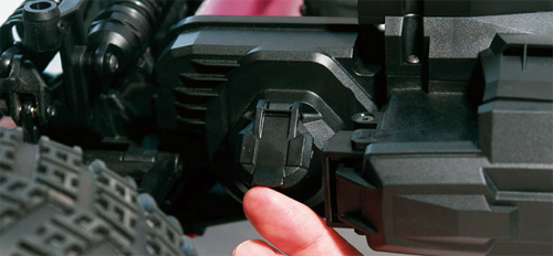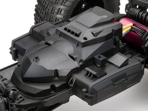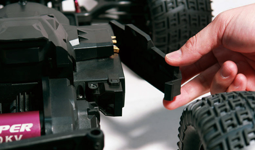 Die schwersten Elemente eines jeden Elektro-Modells, die Akkus werden im „e-MTA“ ungemein handlings praktisch in einem leicht zugängigen Akku- Schacht an absolut tiefster Stelle und optimal zentral im Chassis platziert, was für einen ultimativ tiefliegenden Schwerpunkt sorgt. Geradezu selbstverständlich ist diese gekapselte Halterung so ausgelegt, dass eine Vielzahl von Akku-Typen verwendet und sogar ohne Abnehmen der Karosserie gewechselt werden kann. Von 6 bis 8 Zellen NiMH Packs über handelsübliche 2S (7,4V) bis hin zur ULTIMATE Kraft-Quelle von 3S (11,1V) RC-Car LiPo Hardcases (jeweils im Doppel-Pack…) – der „e-MTA“ ist schlich & einfach für alles gerüstet und kann von brutaler Elektro Brushless Leistung nie genug bekommen…!