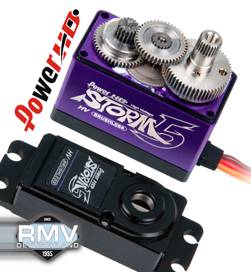 | | RMV Deutschland präsentiert das neue Original Power HD Brushless Premium Digital Servo # Modell STORM-5 ausgelegt bis 8,4V und ausgestattet mit einem gehärtetem Aluminiumgehäuse. Das Power HD Brushless Premium Digital Servo mit CE-Zertifikat und JR-Steckersystem ist mit einem langen Anschlusskabel für den Einsatz in R/C Car und Monstertruck vorgesehen. Die Übergänge am Aluminiumgehäuse sind alle mit einer Wasserschutzkante versehen und zusätzlich durch je einen O-Ring abgedichtet. Der Servohornabtrieb besitzt 25 Zähne. Die Getriebe sind aus Oberflächenveredeltem gehärtetem 7075 Aluminium und nahezu spielfrei gefertigt. Das STORM-5 setzt in seiner Größenklasse Maßstäbe in puncto Ausstattung, Leistung und Zuverlässigkeit.