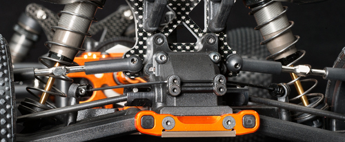 Auch an der Hinterachse wurde eine 4mm dicke Carbon Dämpferbrücke verbaut. Die Aluminium Querlenkerhalter v/h können mit unterschiedlichen Einsätzen, wie man es im 1:8er Bereich gewohnt ist, ausgestattet werden um Toe und Anti-Squat einzustellen.