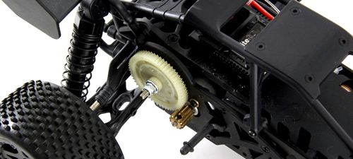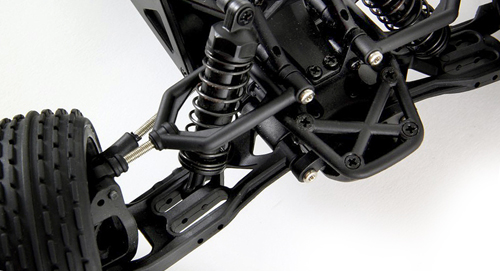 Das voll einstellbare Fahrwerk ermöglicht weitere Möglichkeiten, den Buggy auf seine Fahrweise anzupassen. Sehr hilfreich hierbei sind die präzise arbeitenden Federbeine, die sich sowohl an der Dämpferbrücke wie auch am unteren Querlenker in Ihrer Position ändern lassen und stets für ausreichenden Bodenkontakt zu den High Grip Reifen sorgen. Stabile Metall-Antriebswellen gewährleisten eine verlustarme Kraftübertragung auf die Hinterräder. Dank des präzise montierten Modells heißt es jetzt nur noch den Lipo Akku von unten durch das Chassis in das Modell schieben, Fernsteuerung an, Auto an und los geht es.