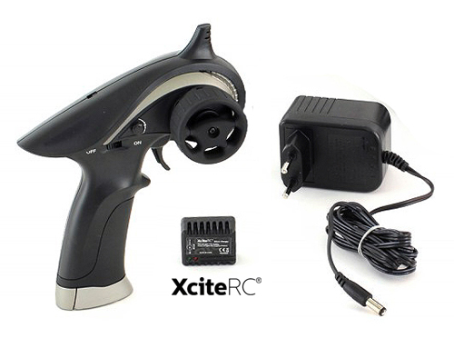 Fahrfertig montiertes Auto, XciteRC XRC2is 2,4 GHz Fernsteuerung, 2in1 Regler/-Empfängereinheit, Lenkservo, Ladegerät, Bedienungsanleitung und 850 mAh Lilo Akku im Blisterkarton.