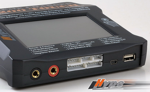 Die Software des X-200 Touch umfasst spezielle Ladeprogramme für NiCd-, NiMH-, LiPo-/LiFe-/LiIo- und Blei-Akkus. Der Balanceranschluss erfolgt direkt am Gerät, das mit XH-Buchsen ausgestattet ist. Weiterhin verfügt der X-200 Touch über ein USB-Interface und einen USB-Ladeausgang.