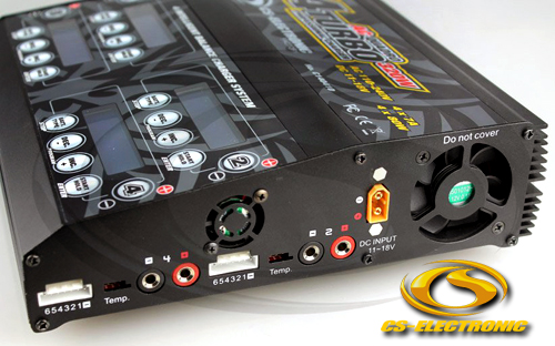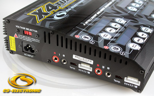 | | Das neu entwickelte CS Space X4 AC/DC Quadro Schnell- Ladegerät besteht aus 4 unabhängigen Schnellladegeräten gespeist von 240V Netzteil. Alle 4 Ladeausgänge laden gleichzeitig mit einer Leistung von 4 x 7A und 4 x 80W alle Akkutypen. Für Lithium Akkus wird der Ladevorgang über 4 eingebaute und kalibrierte 2-6S XH- Balancer kontrolliert.