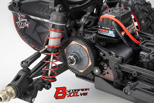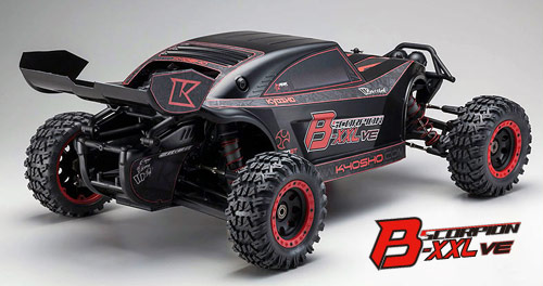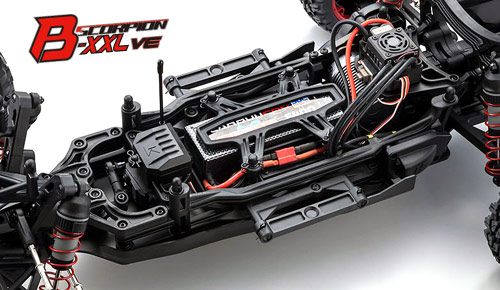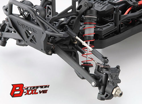 | | Mit dem Scorpion B-XXL VE bietet Kyosho ein Readyset der Superlative an. Nicht nur die Größe ist beeindruckend, auch die Ausstattung kann sich sehen lassen. Das aus 3mm dickem Aluminium gefertigte und mit doppelter seitlicher Versteifung versehene Chassis ist besonders langlebig ausgeführt und bietet eine ideale Basis für coole Bash-Sessions oder harte Rennen auf dem Track.