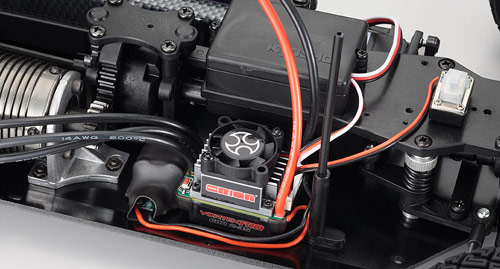 Der DRX VE wird als ReadySet mit dem neuen 2.4GHz Syncro KT-200 Fernsteuersystem geliefert. Das Herzstück des DRX VE ist die Team Orion Vortex Brushless Einheit, die dem Modell auch seinen Namen verleiht. Der Team Orion Vortex 10 Motor ist mit einer 3,17 mm Welle ausgestattet und verfügt über feine Verrippung zur perfekten Wärmeableitung. Der 2.400-KV-Motor ist sensorlos und liefert eine maximale Drehzahl von 28.000 U/min. Die Ansteuerung des Motors erfolgt durch den brandneuen Team Orion Vortex R10 Sport Regler, der speziell für Modelle im Maßstab 1:9 konzipiert worden ist. Der Regler verfügt über einen großzügig dimensionierten Lüfter, der während des Fahrbetriebs permanent aktiv ist. So werden unerwünschte Temperaturspitzen an den elektronischen Bauteilen wirksam vermieden. Der Vortex R10 Sport Regler verfügt über die Funktion vorwärts - Bremse - rückwärts und eine automatische Erkennung der Zellenzahl mit Unterspannungsabschaltung zum Schutz der LiPo-Zellen und kann mit Hilfe der optional erhältlichen Setting Box R (#ORI65150) individuell programmiert werden.