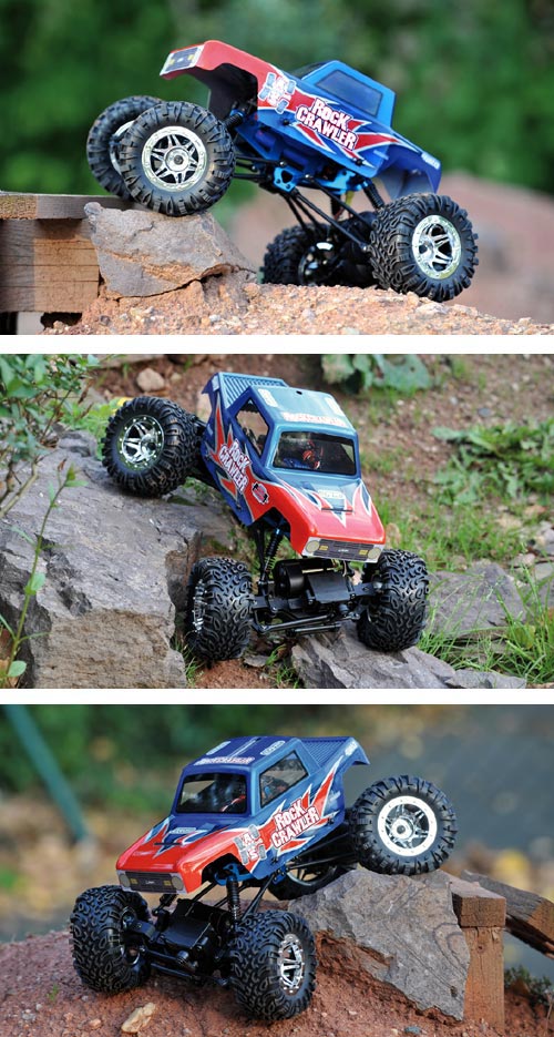 Dank extrem stabilem Fahrgestell mit zwei vertikalen Chassisplatten aus blau eloxiertem Aluminium, drehend gelagerten Öl-Druckstoßdämpfern und unfassbar (hohen) großen Federwegen besitzt der Rock Crawler eine unvergleichliche Geländegängigkeit – in Zahlen: 51° Achsverschränkung, 51° Steigfähigkeit und 47° Rampenwinkel. Für den nötigen Vortrieb sorgt ein speziell entwickelter Antrieb mit zwei Sperrdifferentialen für maximalen Vortrieb in jeder Situation. Zusammen mit dem permanenten Allradantrieb aus 2 speziellen 380er Crawling Motoren mit höchstem Drehmoment auch bei niedriger Drehzahl (sowie 2 Sperrdifferentiale) treibt es den Rock Crawler auch in dem unwegsamsten Terrain unaufhaltsam vorwärts.