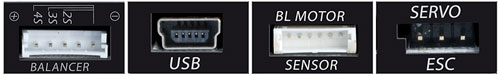 von links nach rechts: integrierter Lixx Balancer; USB für Firmware-Updates; BL Motor Anschluss für Sensor-/Drehzahl-Check; Simulationsanschluss für Funktionstest Regler/Servo