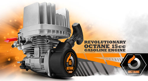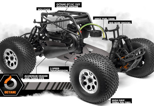 Der Octane Motor wird von einem riesigen 300ccm vorwärts-montierten Benzintank mit Benzin versorgt - Laufzeiten von über 20 Minuten sind kein Problem! Der GT15C wird von einem 2-Stufen Luftfilter geschützt und ein an der Kurbelwelle montiertes Lüfterrad sowie ein massiver Aluminium Kühlkopf halten den Motor während der Fahrt kühl. Zum absoluten Schutz ist der Motor komplett umschlossen von einem Überrollkäfig, der zusätzlich als praktischer Tragegriff dient!