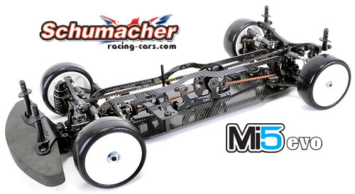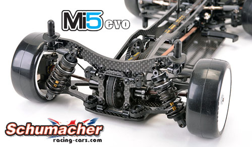 | | Der Mi5evo von Schumacher ist eine völlig neue Tourenwagen Entwicklung, auf Basis des sehr beliebten MI5, welche bereits die BRCA Meisterschaft gewinnen konnte. Der Mi5evo wurde mit einigen revolutionären Design-Features ausgestattet, bietet dem Fahrer noch mehr Set-Up Möglichkeiten für Asphalt und Teppich-Strecken. Durch den extrem niedrigen Schwerpunkt hat der Mi5evo eine fantastische Kurvenlage und sehr hohen Corner-Speed.