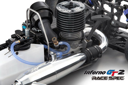 Das GT2-Chassis verfügt über eine hochbelastbare Doppelscheibenbremse und ist auf den typischen Glattbahneinsatz abgestimmt. Der permanente Allradantrieb garantiert die effiziente Umsetzung der Motorleistung in Vortrieb. Der Tank hat ein Fassungsvermögen von 150 ml und ermöglicht dadurch Fahrzeiten von ca. 11 Minuten. Die Spurstangen verfügen über R/L-Gewinde und stammen aus dem bewährten Inferno US Sports.